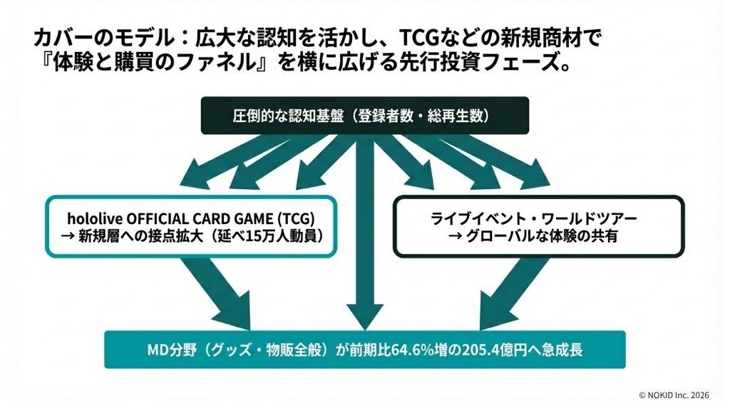 カバーは、登録者数の認知の広さを活かしながら、TCGやワールドツアーなど大型投資で新たなファン接点を創出しています。