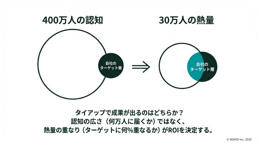 しかし、タイアップ先の選定で登録者数が多い=リーチが大きいという基準だけで選ぶと、期待した効果が出ないことがあります。登録者数はあくまで認知の広さであり、そのファンがあなたのブランドのターゲット層と重なっているかは別の問題だからです。