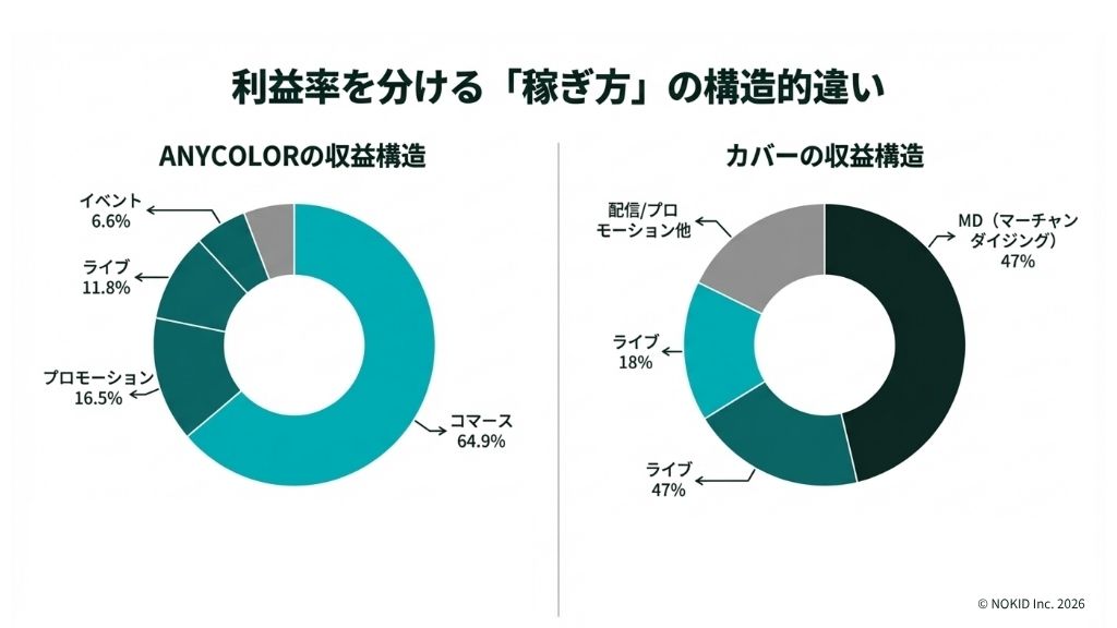 | 最大の収益源 | コマース(グッズ・ボイス)65% | MD(TCG含む)47% + ライブ18% |