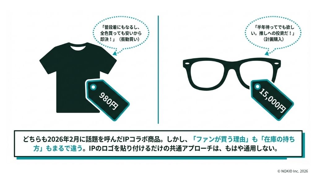 本記事では、2026年に話題をさらった4つのコラボ商品を取り上げ、その設計思想の違いを読み解いていきます。980円のTシャツと15,000円のメガネ。この価格差の裏にある設計のロジックがわかれば、自社のコラボ商品をどう設計すればいいかが見えてくるはずです。
