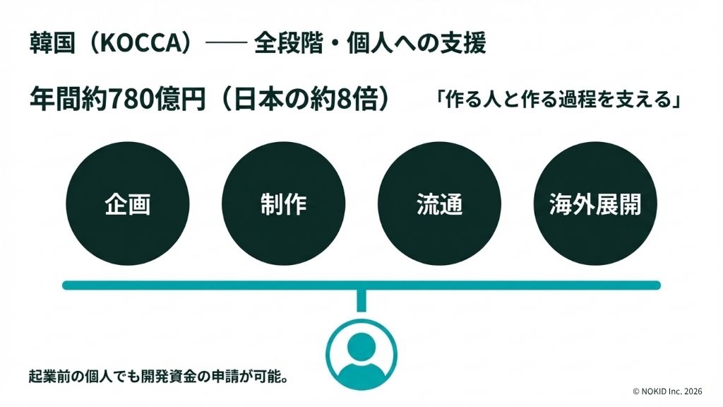 違いは金額だけではありません。KOCCAは企画から制作、流通、海外展開まで、すべての段階を支援しています。そして最大の違いは、法人でない個人でも申請できることです。