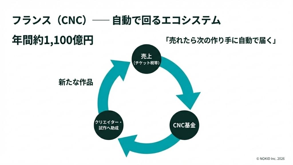 コンテンツが売れれば、その一部が次の作品づくりに自動で回る。政治家が毎年予算を決める必要がない仕組みです。