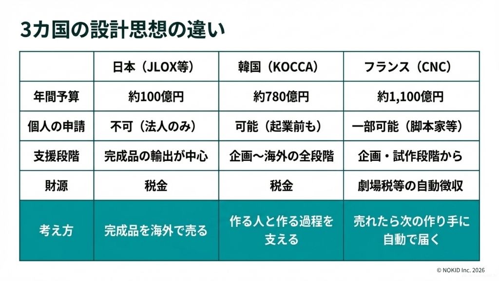 | 項目 | 日本(JLOX等) | 韓国(KOCCA) | フランス(CNC) |