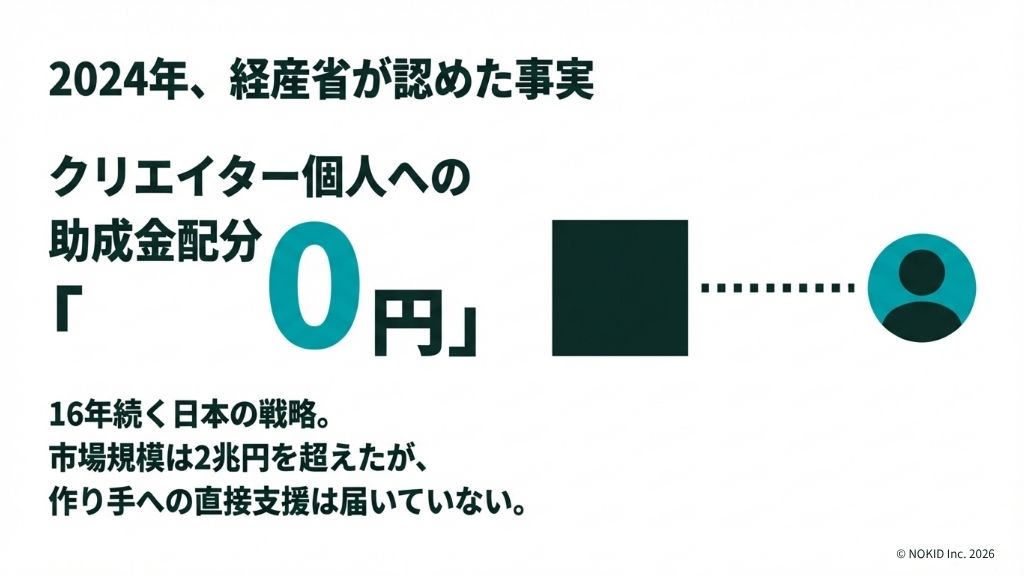 アニメ・ゲーム業界に対する助成金のうち、クリエイター個人への配分はゼロだった、と。