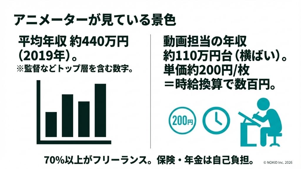 しかも、アニメーターの70%以上がフリーランスです。健康保険も年金も全額自分で払います。手元に残るお金は、見た目の数字よりさらに少ないのです。