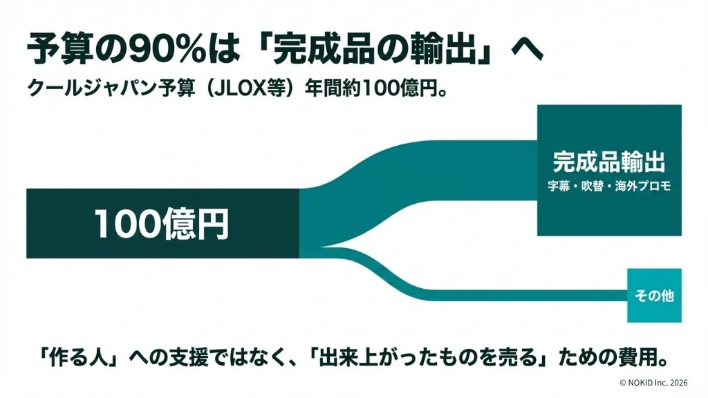 映像産業振興機構(VIPO)のデータによると、予算は通常時で年間約100億円。その約90%は、字幕や吹き替えの制作(ローカライズ)と海外プロモーションに使われていました。