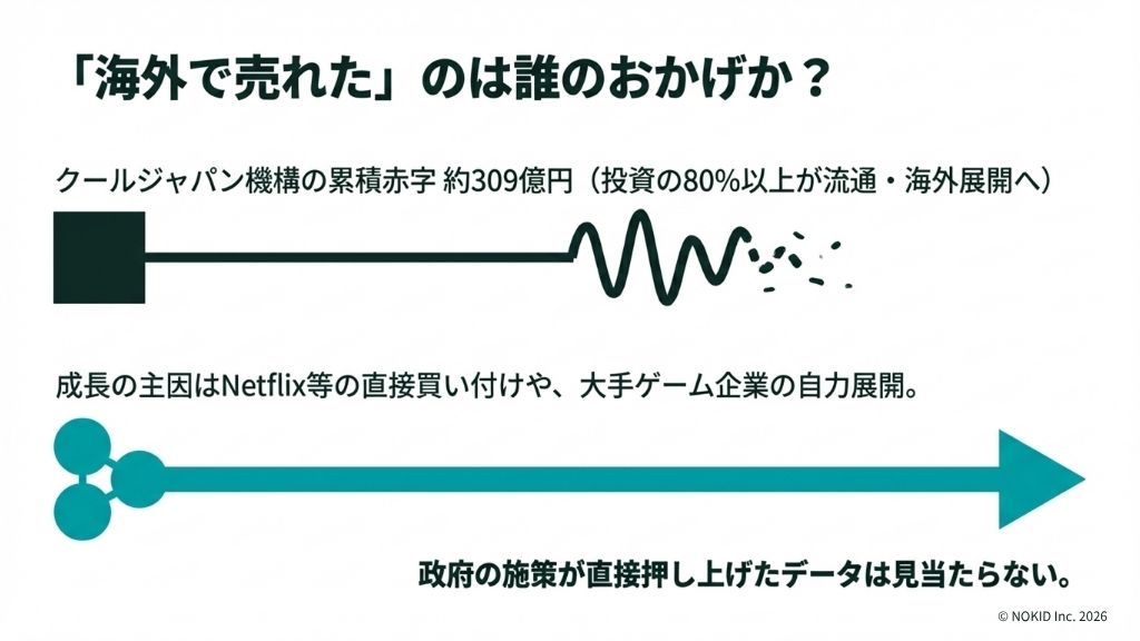 お金は「完成品を海外で売る支援」に集中していた。でも、実際に売れたのは民間の力。そういう構図です。