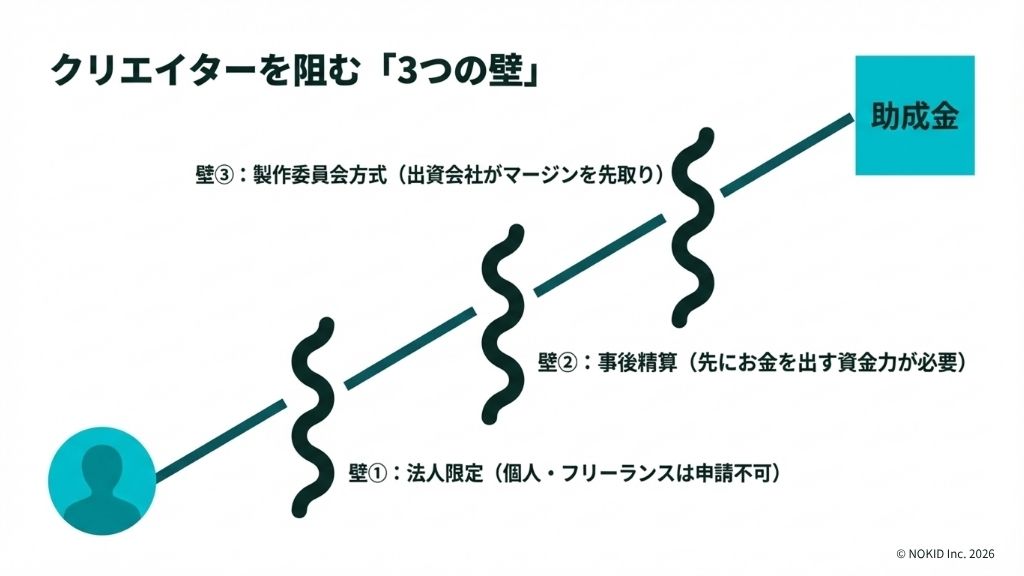 お金の流れは分かりました。では、クリエイター個人が助成金を使おうとしたとき、何が起きるのか。ここには3つの壁があります。