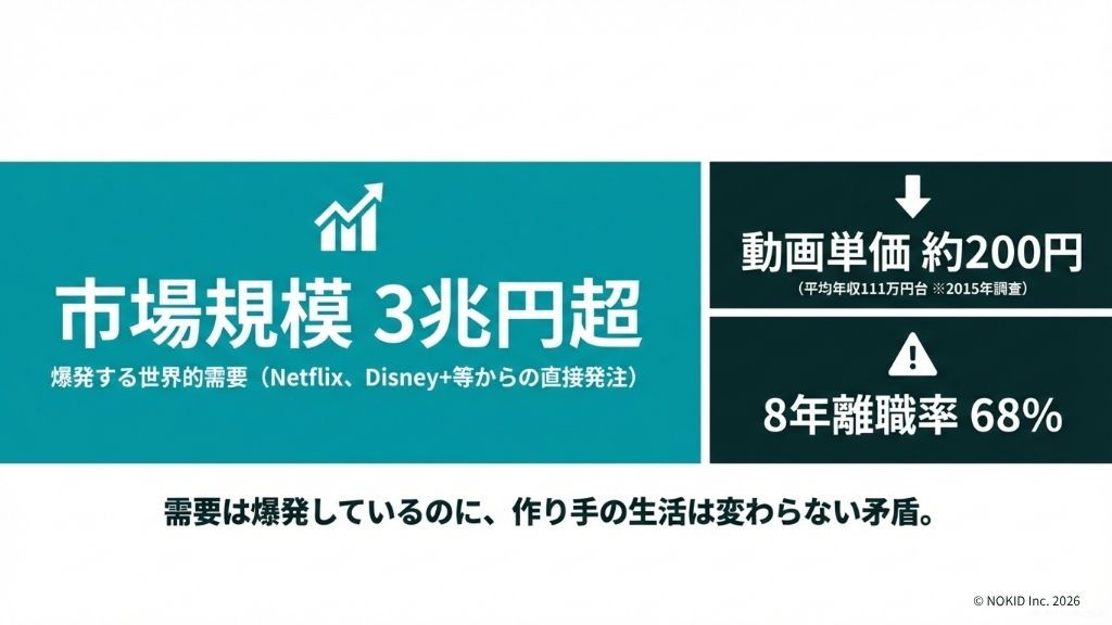 需要は爆発しているのに、作り手の生活は変わらない。この矛盾が、アニメ業界の最も深い問題です。