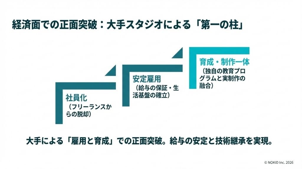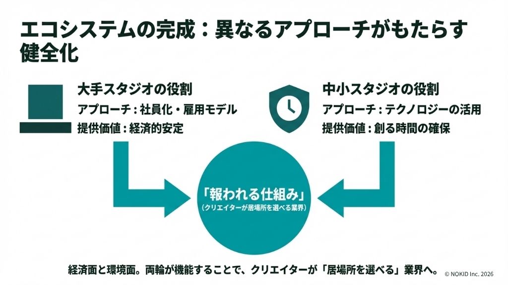 大手の社員化と中小スタジオのテクノロジー活用、それぞれ異なるアプローチが同時に進むことで、クリエイターの選択肢は広がります。どちらか一方ではなく、両方が機能する業界が健全です。