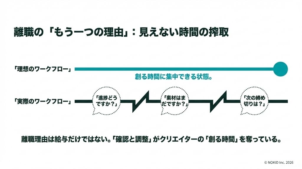 この「確認と調整」のコストは、給与明細にも勤務時間にも現れません。でも、クリエイターが1日に使える「本当に創る時間」を確実に削っています。