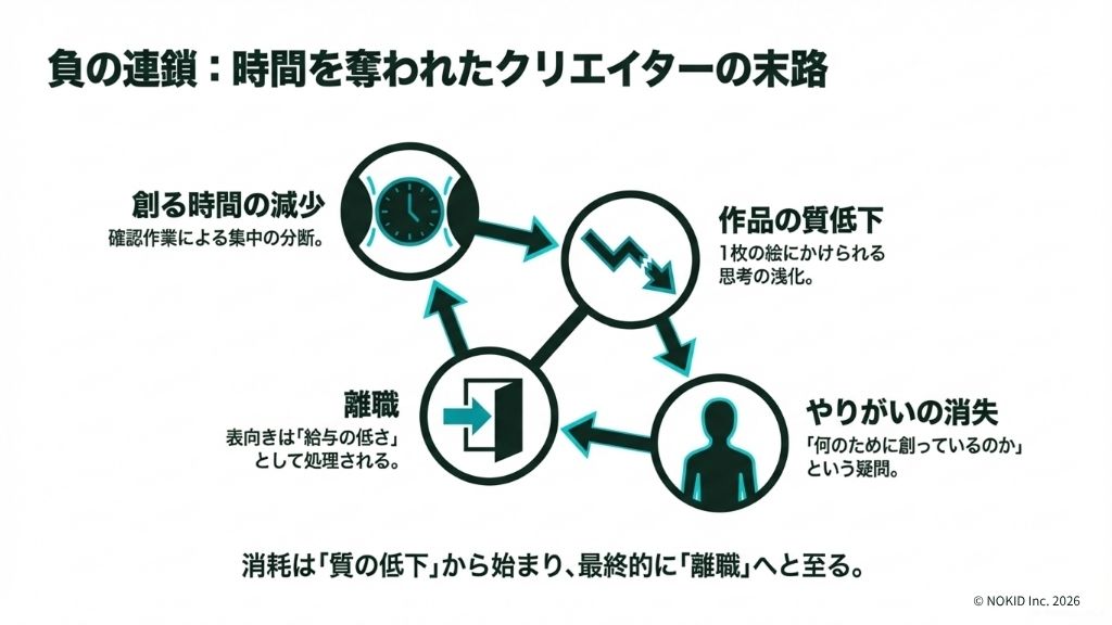 アニメーターの離職要因は給与の不安定さだけではありません。日々の確認・調整に追われて「創る時間」が削られる消耗が、やりがいの消失と品質低下を招き、最終的に離職につながっています。