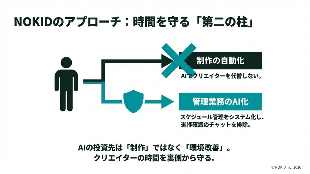 NOKIDには一つの方針があります。AIへの投資を、クリエイターが創ることに集中できる環境づくりに振り向ける、ということです。