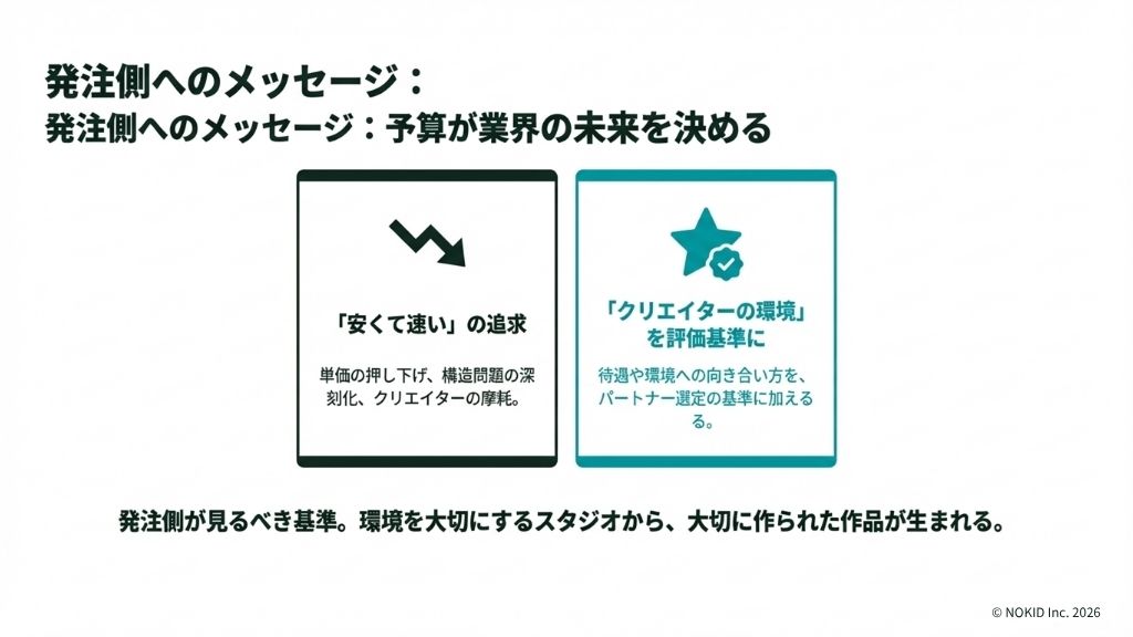 ここまで、クリエイター側とスタジオ側の話をしてきました。もう一つ、発注する側にも考えてほしいことがあります。